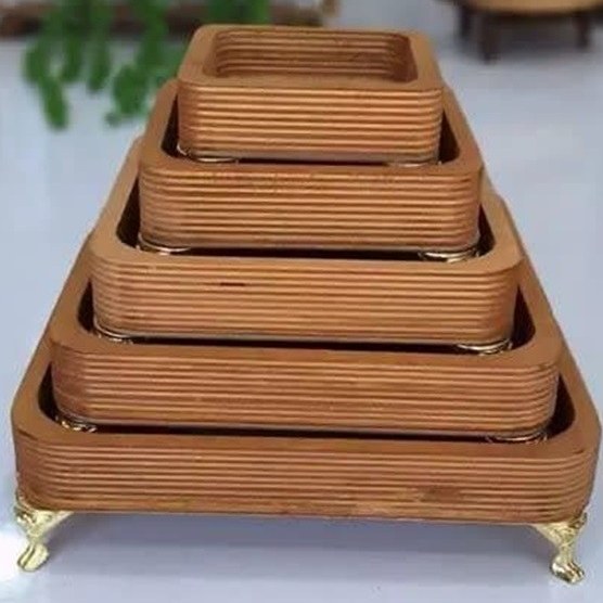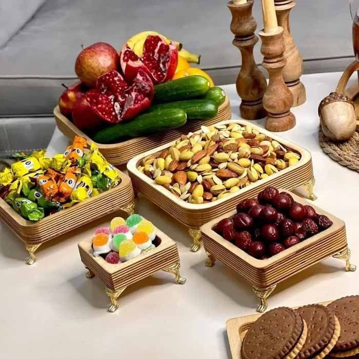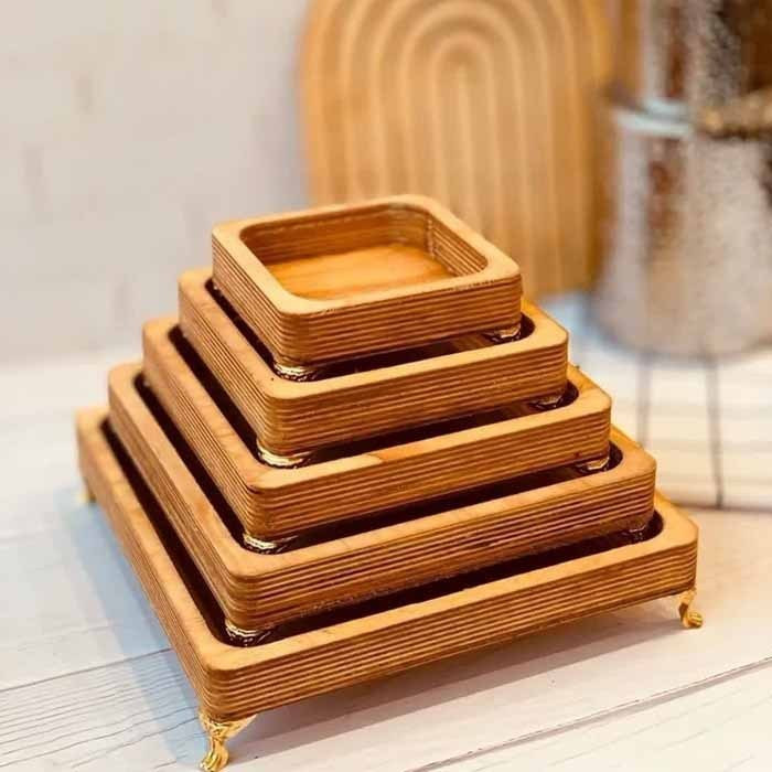 ست سینی ۵تکه مربع در سایزهای ۱۰ تا ۳۰ سانتیمتری. ساخته شده از مواد باکیفیت، ضد آب و آغشته به روغن گیاهی. رنگ کرم تیره شیک که جلوهای مدرن به دکوراسیون منزل شما میدهد. شیرینگ شده و مقاوم در برابر رطوبت.